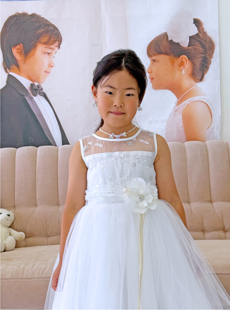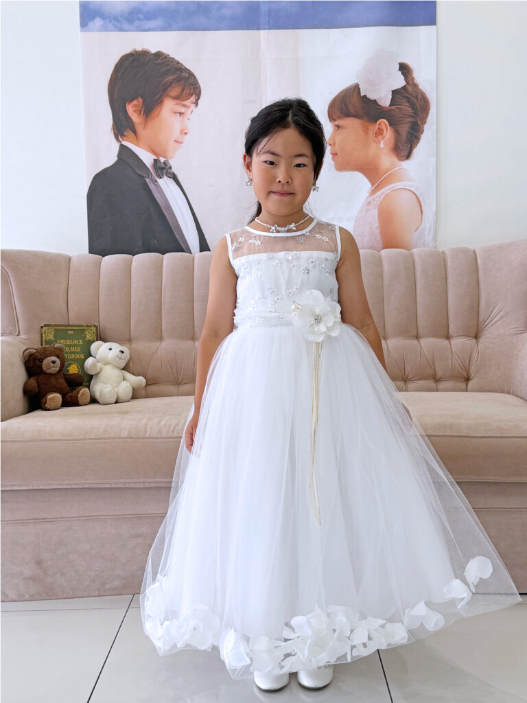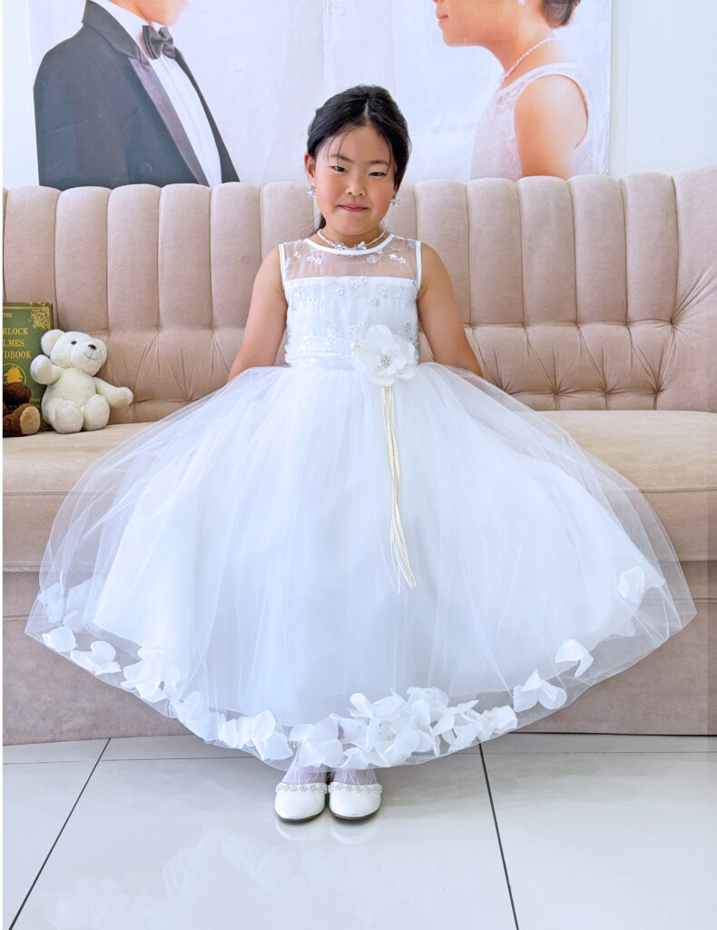 今回お選びの子供ドレスは、ホワイトのスカート裾に花びらがある華やかなドレス💐