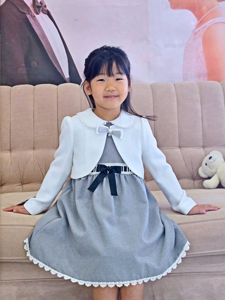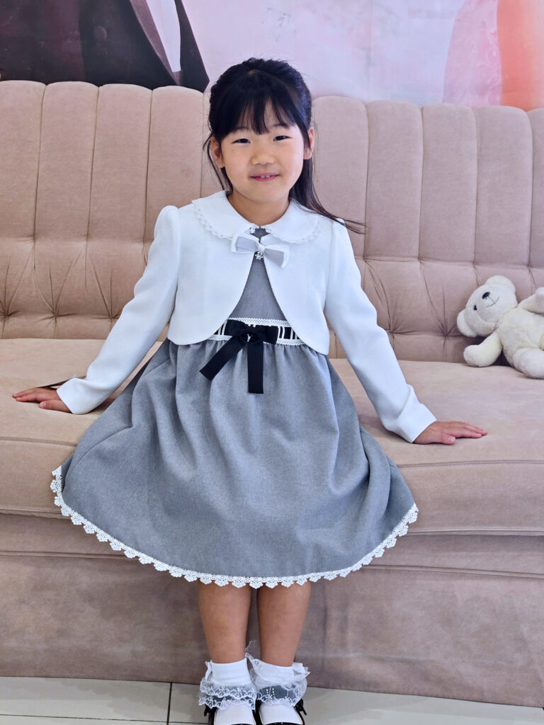 お客様のお選びのフォーマルは、ワンピースにボレロのセット、リボンやスカートのレースが可憐で愛らしい姿を演出してくれます🥰